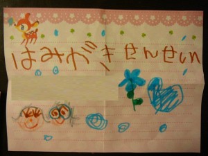 さて、先日うれしい事がありました。むし歯チェックに来てくれているMちゃんから、お手紙をいただきました。うれしい—-!地域の皆さまのむし歯予防に精一杯がんばりたいと思います。これからもヨロシクね!