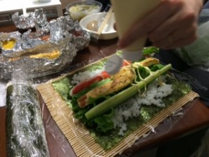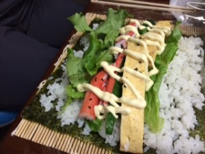 具材は持ち寄り(ⅮH秋山さんとシュイナーさんが素敵な具材を持ってきてくださいました!)、巻き担当は私岡野が心を込めて作りましたよ。(笑)