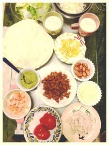 Tacosとえび餃子です。一緒に作って食べるといつもより美味しいですね。